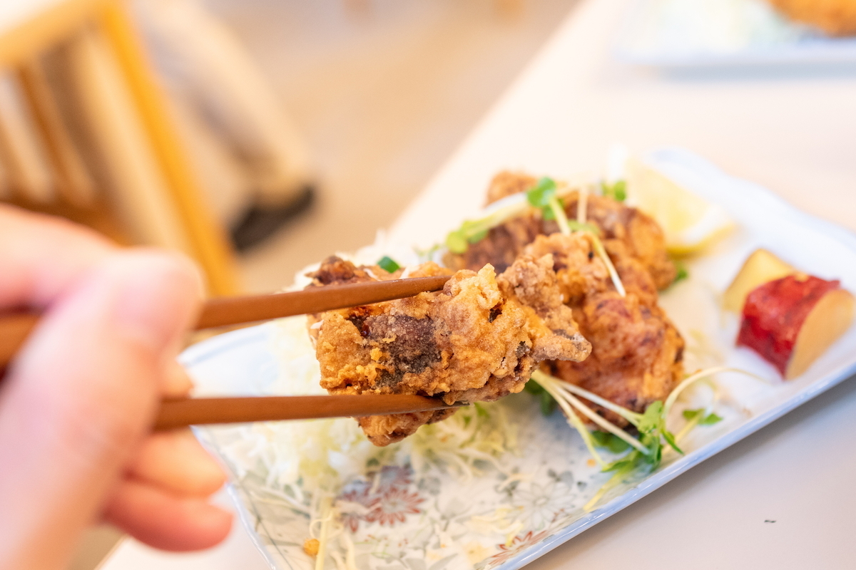 奥さんは国産若鶏の塩麹からあげ!衣はパリッとさくさく、中はじゅわっとジューシーな揚げ具合のからあげです。定食はそれぞれ1500円前後なので、丸の内界隈で食事をするなら十分納得の金額。