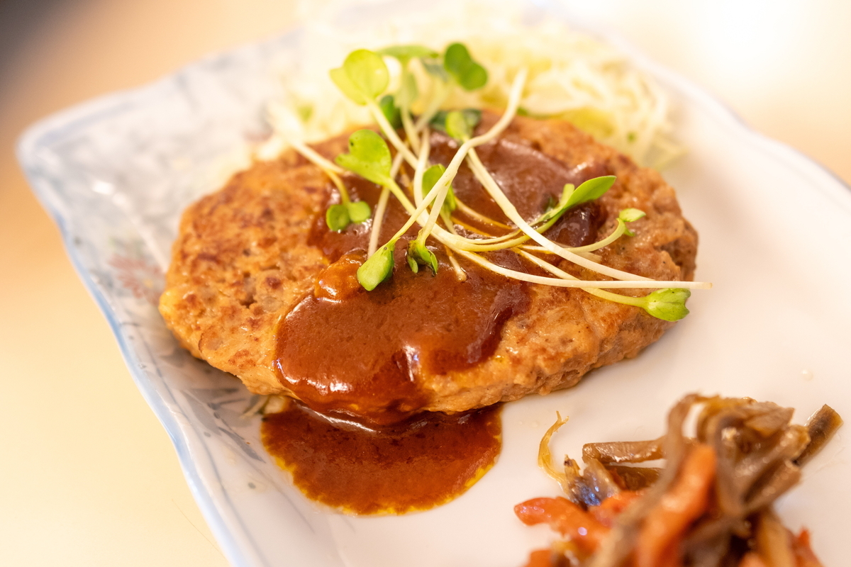 今回私が注文したのはやわらかく焼き上げられたハンバーグ!噛めば肉汁がじゅわっとあふれるジューシーさ、味付けはやさしくて、子どもにも食べさせられるのがうれしいところ。