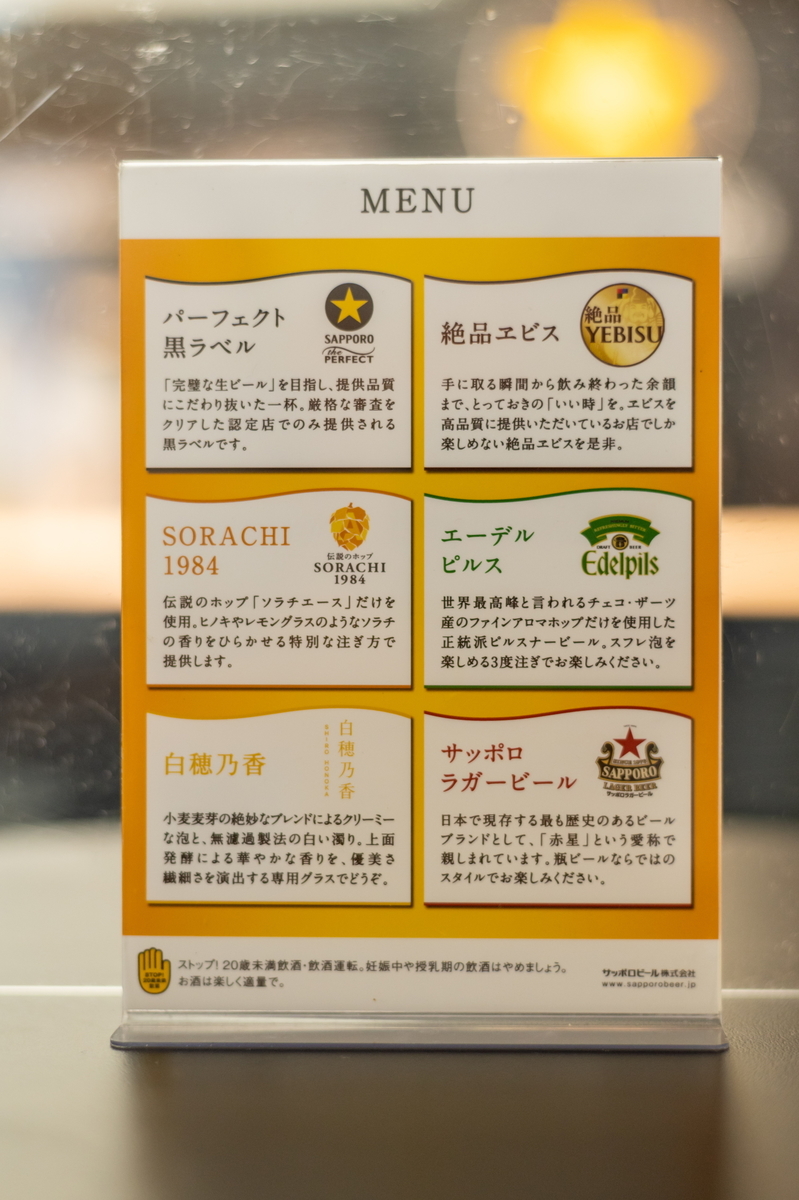 そろそろラストオーダーの時間が近づいて、次がラストの1杯になりそう。最後にチョイスしたのはヱビスビールでした。「絶品」ヱビスと銘打った1杯をいただきましょう。