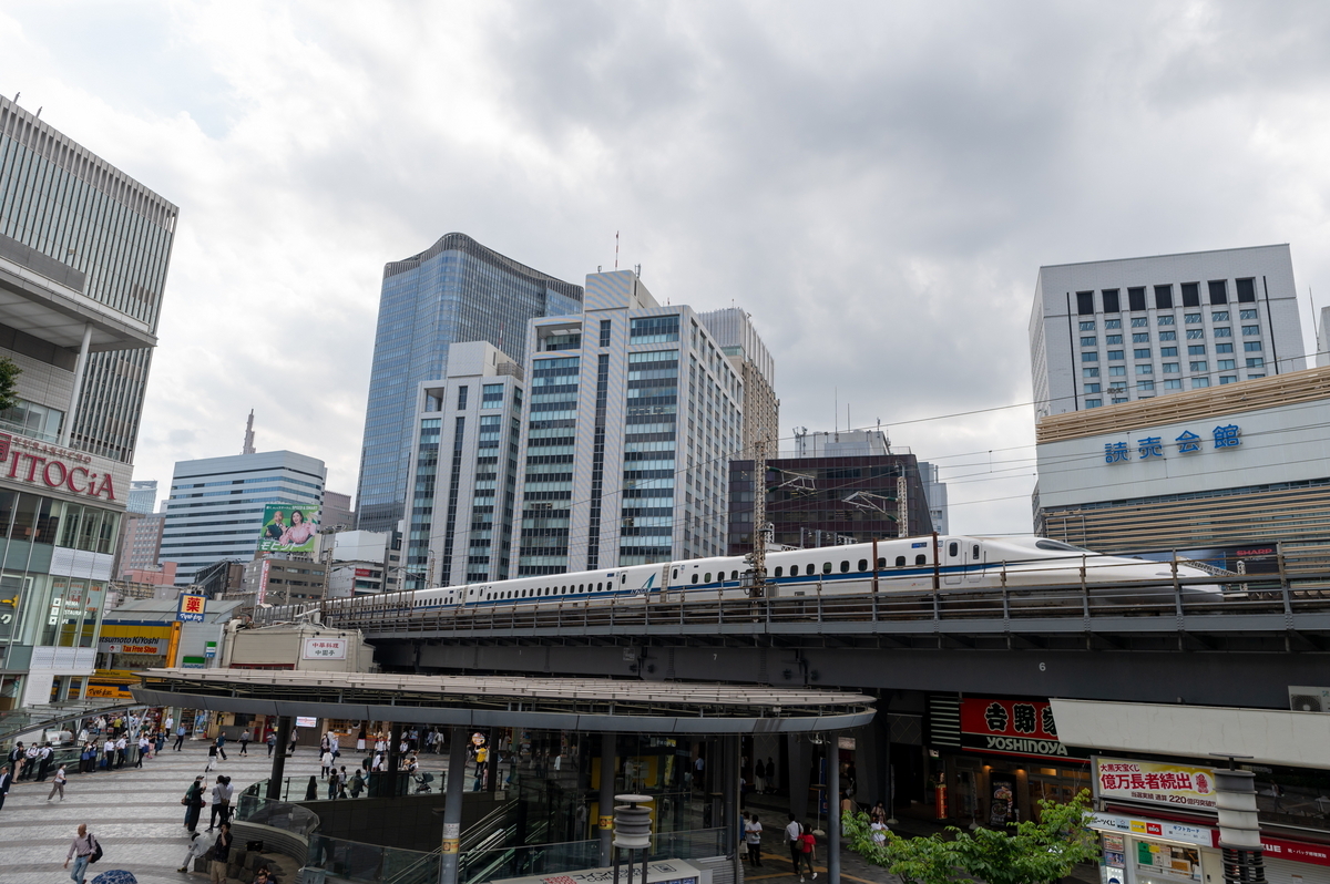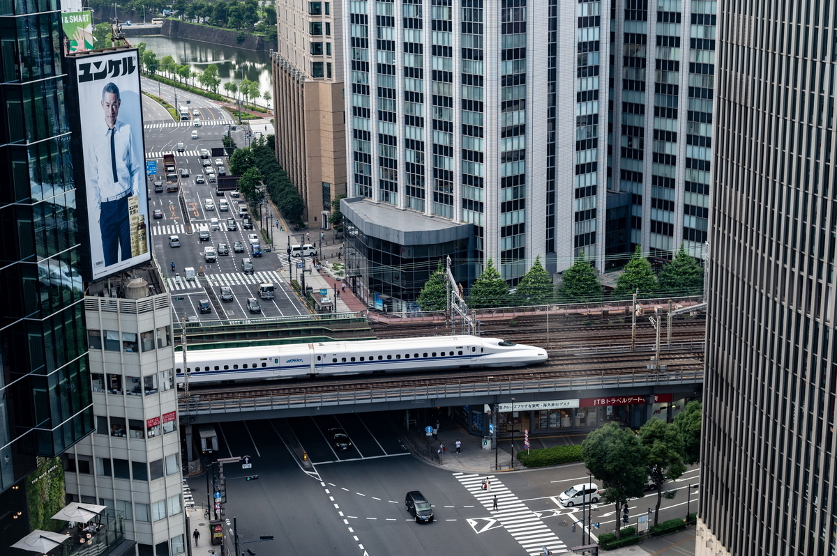 ビルの谷間から新幹線がシュッと出てくるのはいいですね。写真を撮る分には「いつ出てくるんだ......」とドキドキしてしまいますが。
