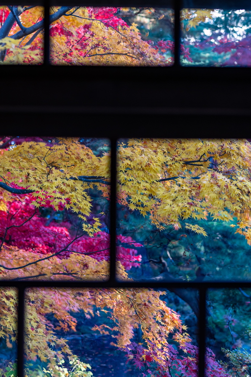 ガラス戸の格子に区切られたモミジ。ステンドグラスみたいでキレイ。