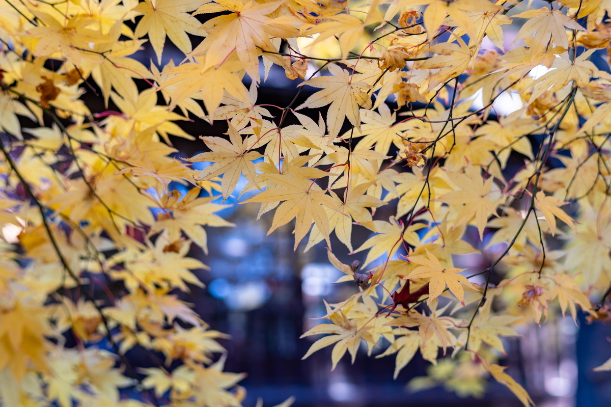 どこにカメラを向けても絵になる。背景暗め×黄色いモミジは星みたい。