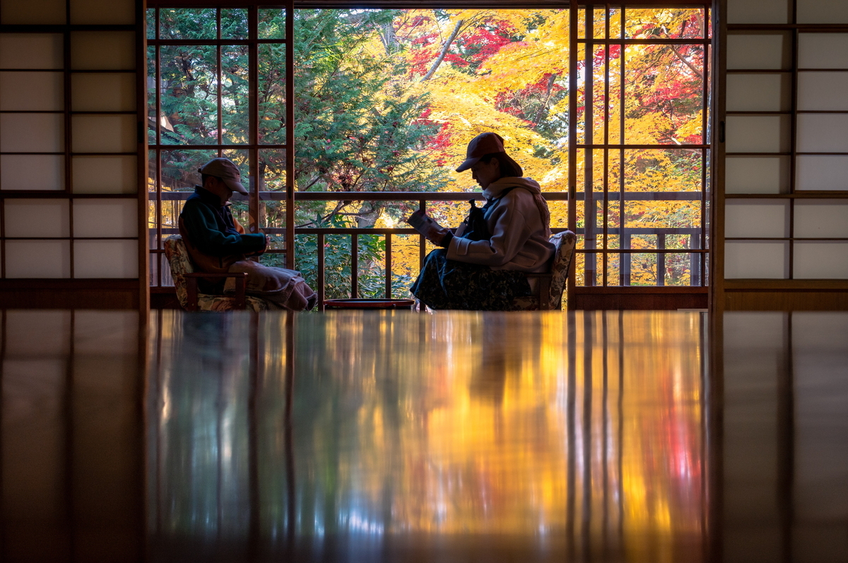 庭園から再びお屋敷にあがって「南昌の間」と呼ばれる大広間へやってきました。庭園に面した縁側からは、色鮮やかな景色が目の前で楽しめるようになっています。そして、よく磨かれた床板に外のモミジが映りこむ姿が美しい...!「床もみじ」とも呼ばれる理由がよくわかります。